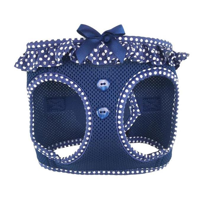 This Harness is a playful, safety-first design with a frill at the neck and color-matching polka dot trim. Available in multiple colors and sizes XXS–3XL.