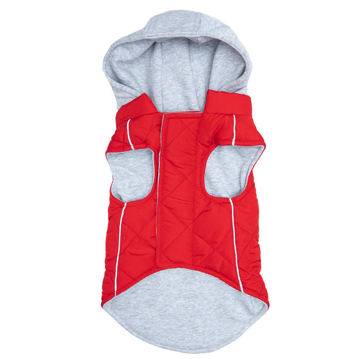Our Weekender Sweatshirt Hoodies are great for pups on the go! The outer shell is a quilted puffer style while the inner lining is cozy jersey material. The hood is also made of jersey material and can easily zip off when not needed. Reflective striping makes your pup noticeable in low light while the two-inch fastener down the chest provides an adjustable closure. Zippered pockets on the back provide a cute finishing detail, as well as an easy place to stash a few treats or a waste bag.
